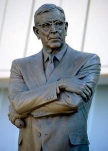 I wrote a multiple-round trivia game once when Len was recovering from surgery and couldn’t get out to trivia. It took about eight hours to put together an even halfway decent game and gave me a great appreciation for the people who write them on a regular basis. I was proud, though, of the picture round, which was “Statues in Southern California.” I included the scary Lucille Ball statue in Palm Springs (which isn’t as bad as the one they replaced in her hometown of Celoron, New York), the Jackie Robinson one at his eponymous UCLA stadium (there wasn’t yet one at Dodger Stadium–that just happened this month!), Jack Benny, Will Rogers, Tommy Trojan, and these, which you may recognize (answers at the end of the post):